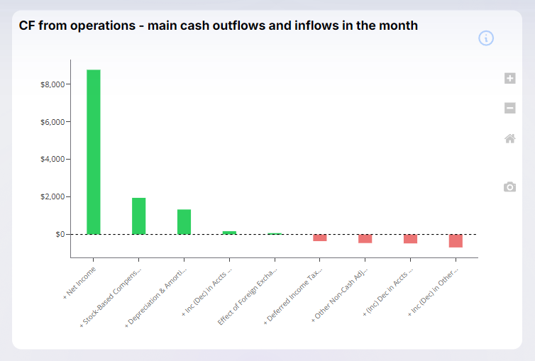 • Analyse and visualize the evolution of every account in your chart of accounts (e.g. rent, salaries, AR, AP, debt, cash...).