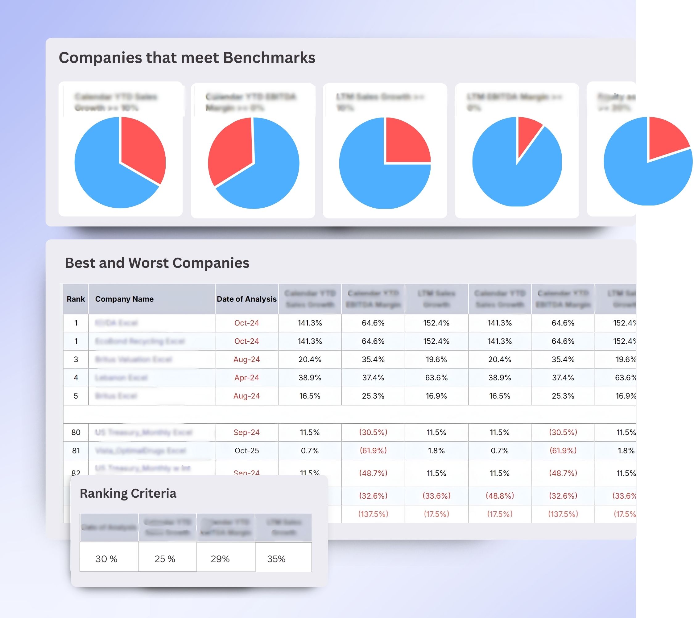 Qokoon benchmarks your companies across different criteria and ranks them, helping you identify your worst performers and the reason for their troubles.